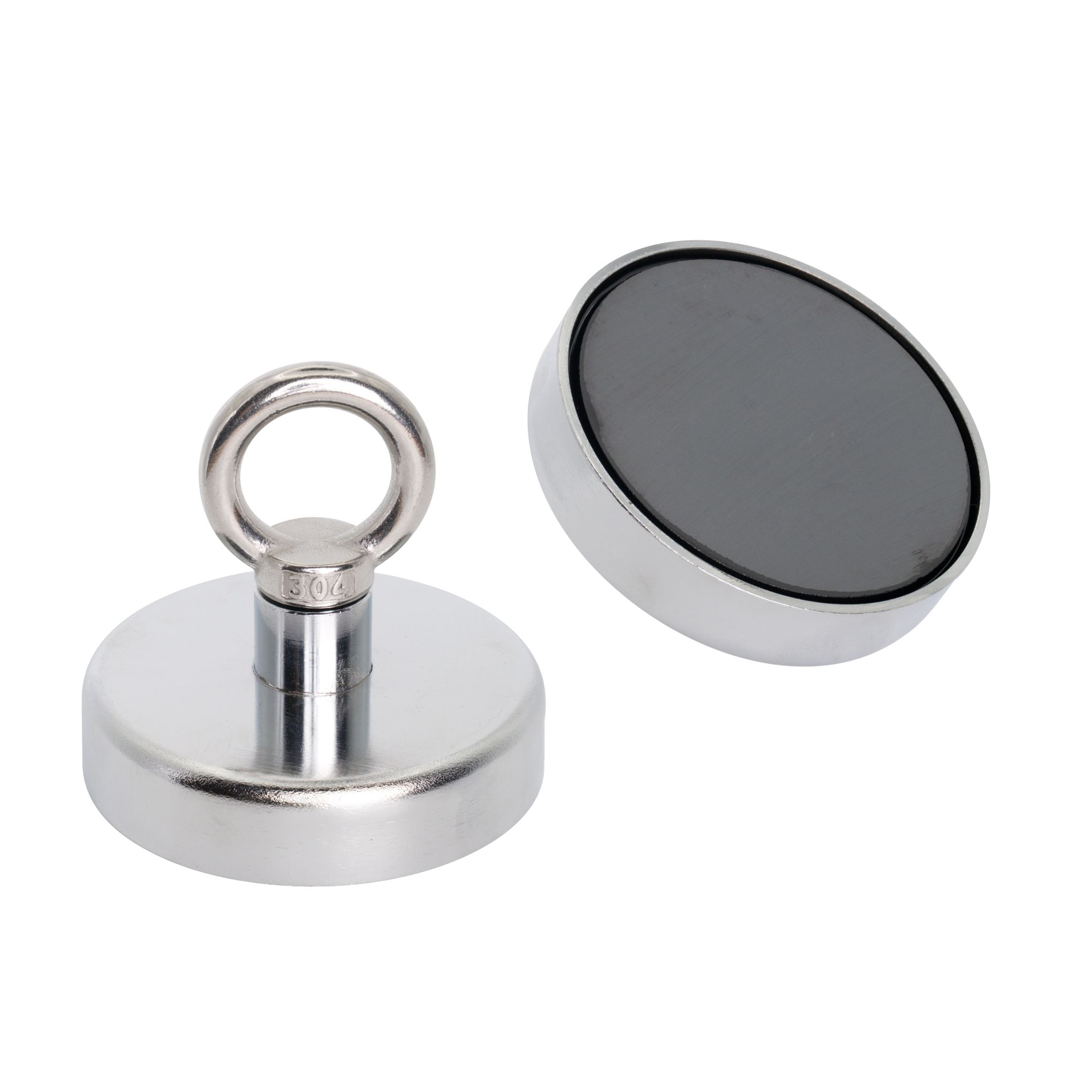 These large ceramic pot magnets are made of a ceramic magnet sunken in to a chrome-plated steel shell meaning that the north pole is on the centre of the magnetic face and the south pole is on the outer edge around it. The steel pot increases the adhesive force of the magnets giving them an incredible hold for their size. Each magnet comes assembled with a heavy duty eyebolt that can easily accommodate a thick lifting robe or cable. An added advantage of pot magnets is that they are resistant to chipping or cracking following constant impact with a steel surface. These magnets come with a safe-handling warning; because they are so powerful they can be dangerous if not handled carefully.