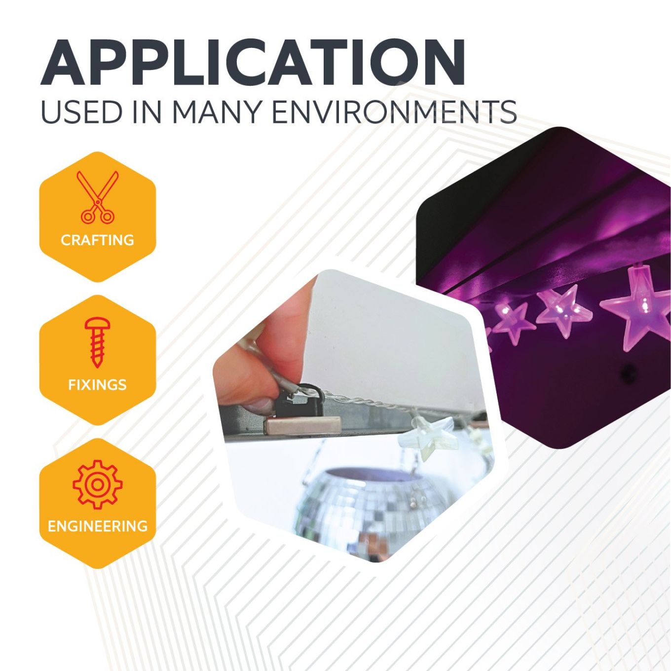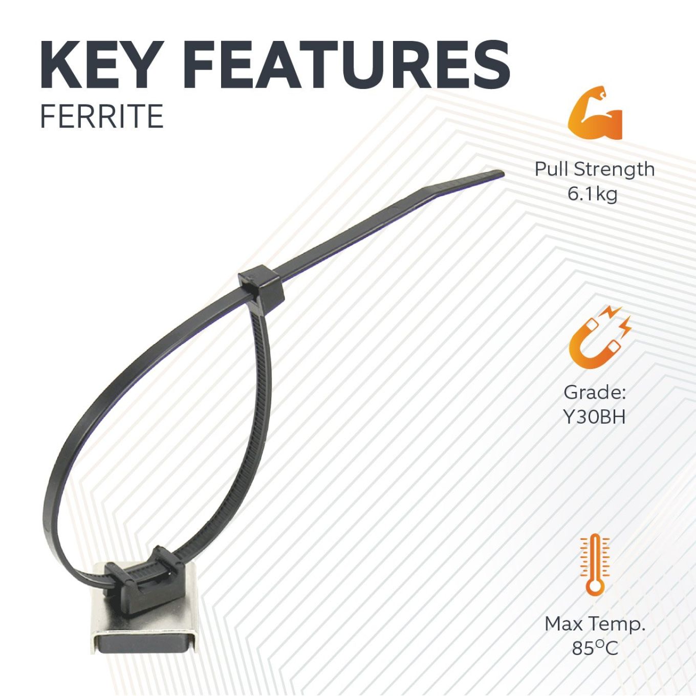 These magnets remove the need for any drilling or adhesives when installing cables or wiring and allow you to attach, detach and move cables instantly, saving lots of time with office, retail and workshop refits. Each magnet is capable of supporting 6.1kg (13.44lbs) of weight in a vertical position against a steel surface and is supplied with one black 4.7mm (0.19 in.) wide cable tie.
