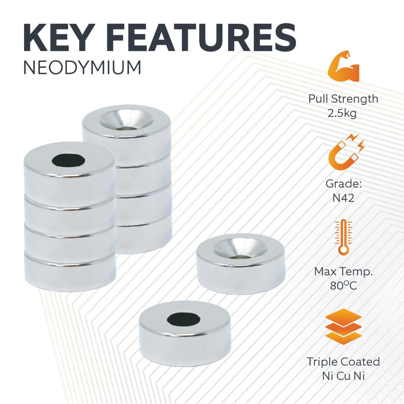 Small high-performance countersunk Neodymium (N42) magnets available with either pole on the countersunk face.