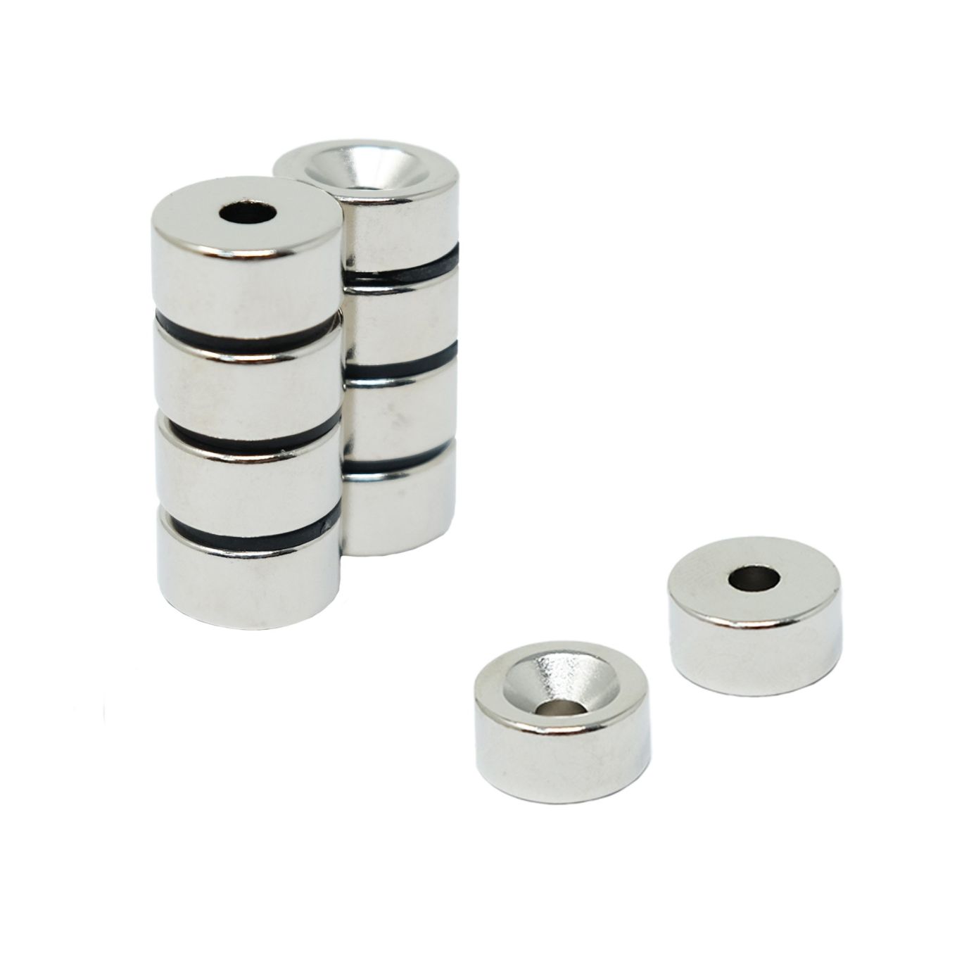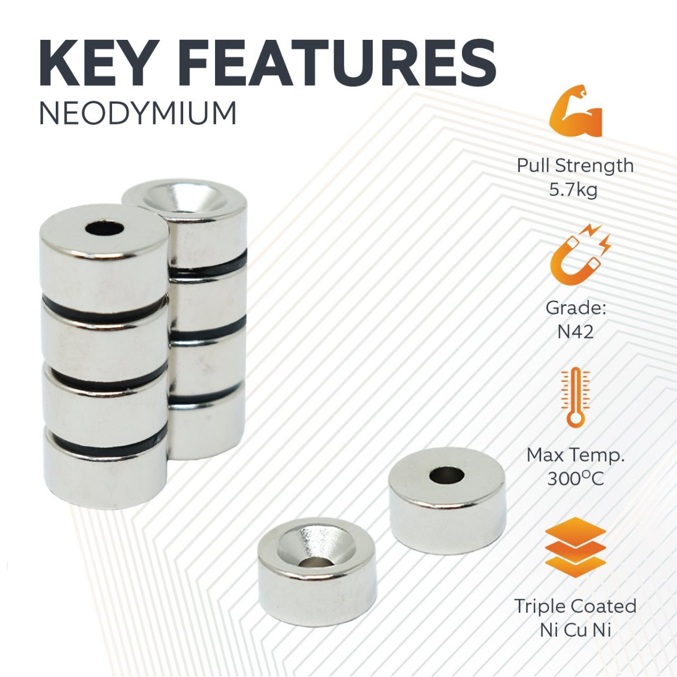 High-performance countersunk Neodymium (N42) magnets available with either pole on the countersunk face.