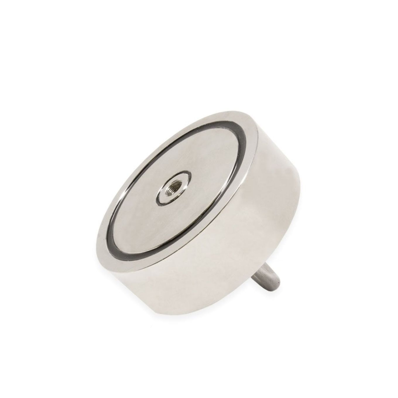 Super-strong Neodymium pot magnet with an M12 eyebolt fitting on the 4 9/16" face and an M10 eyebolt fitting in the side.