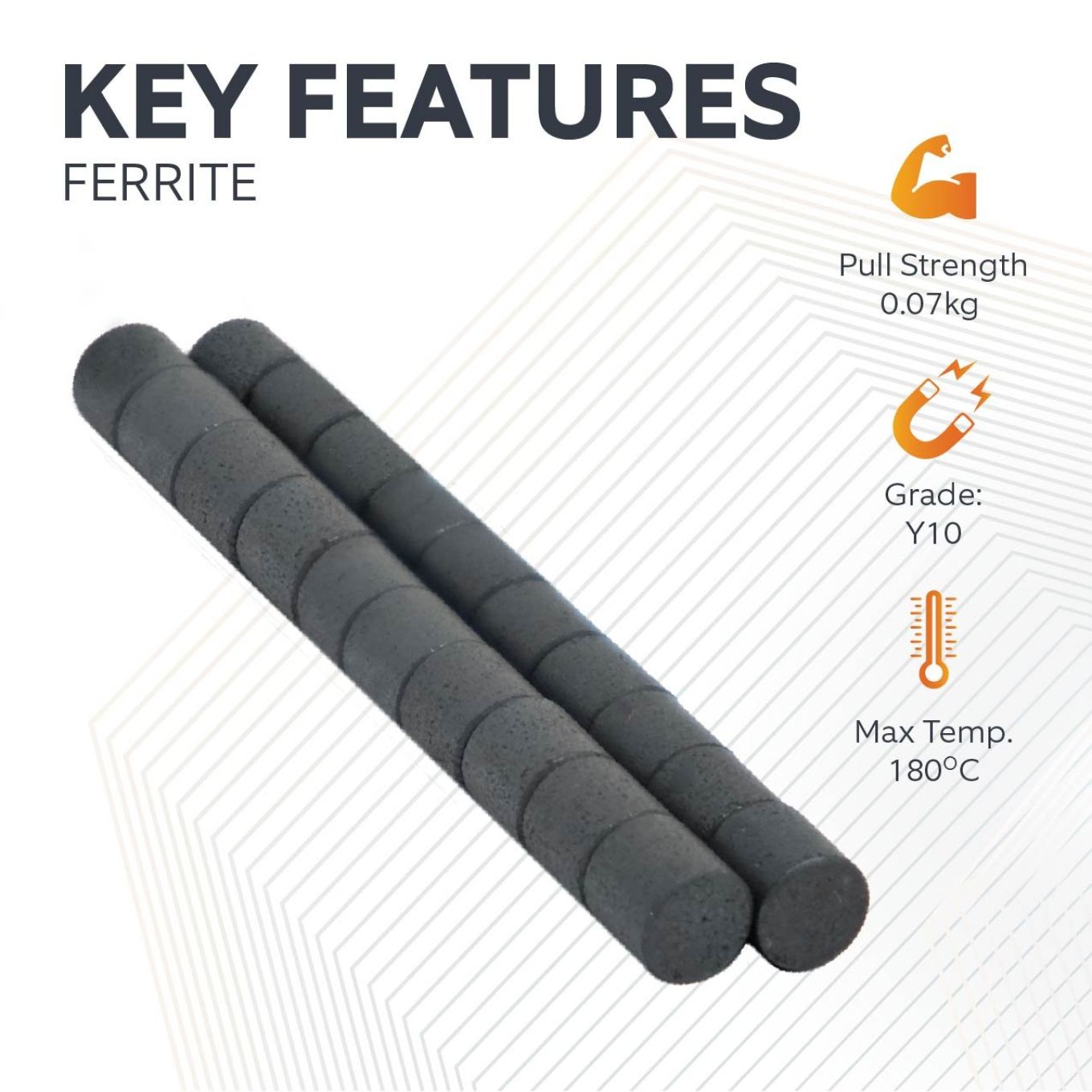 These small cylindrical Ceramic (Ferrite) magnets are magnetized with their north and south poles on opposite flat faces. Each magnet will hold up to 0.15lbs in a vertical position against a steel surface.