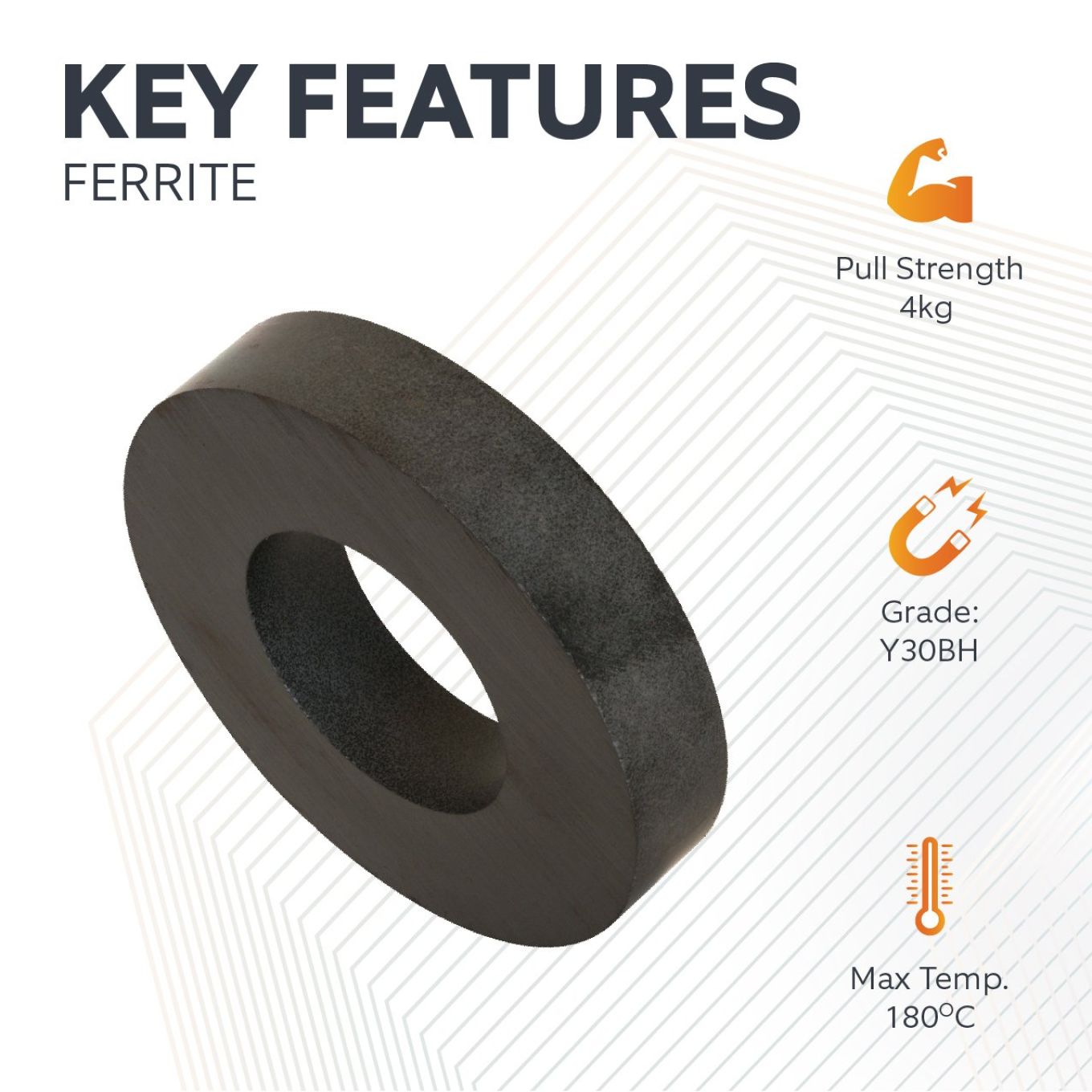Commonly used in loudspeaker systems and magnetic rollers among many other applications, these versatile, medium-sized Ceramic (Ferrite) ring magnets provide excellent resistance to demagnetisation and corrosion at unbeatable value.